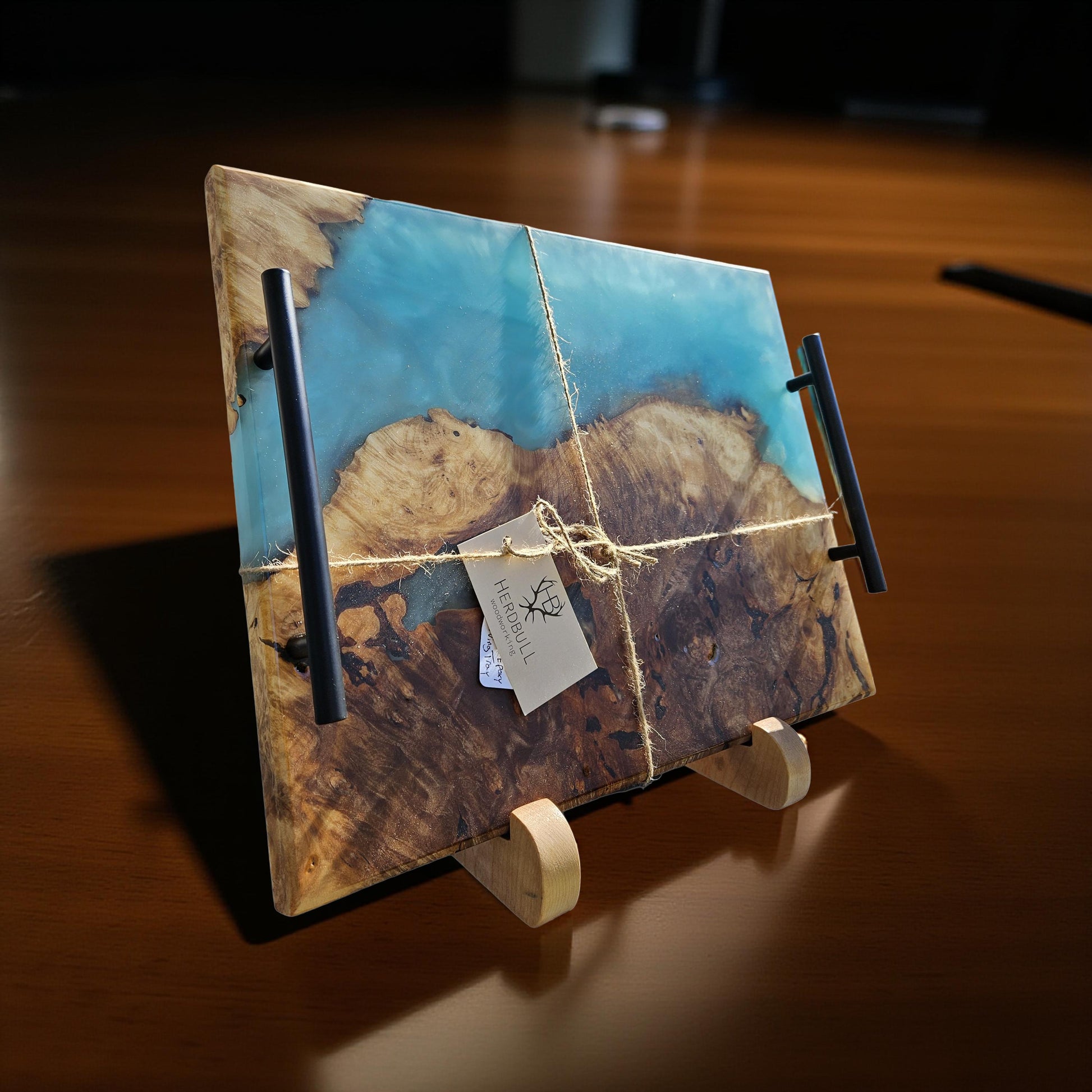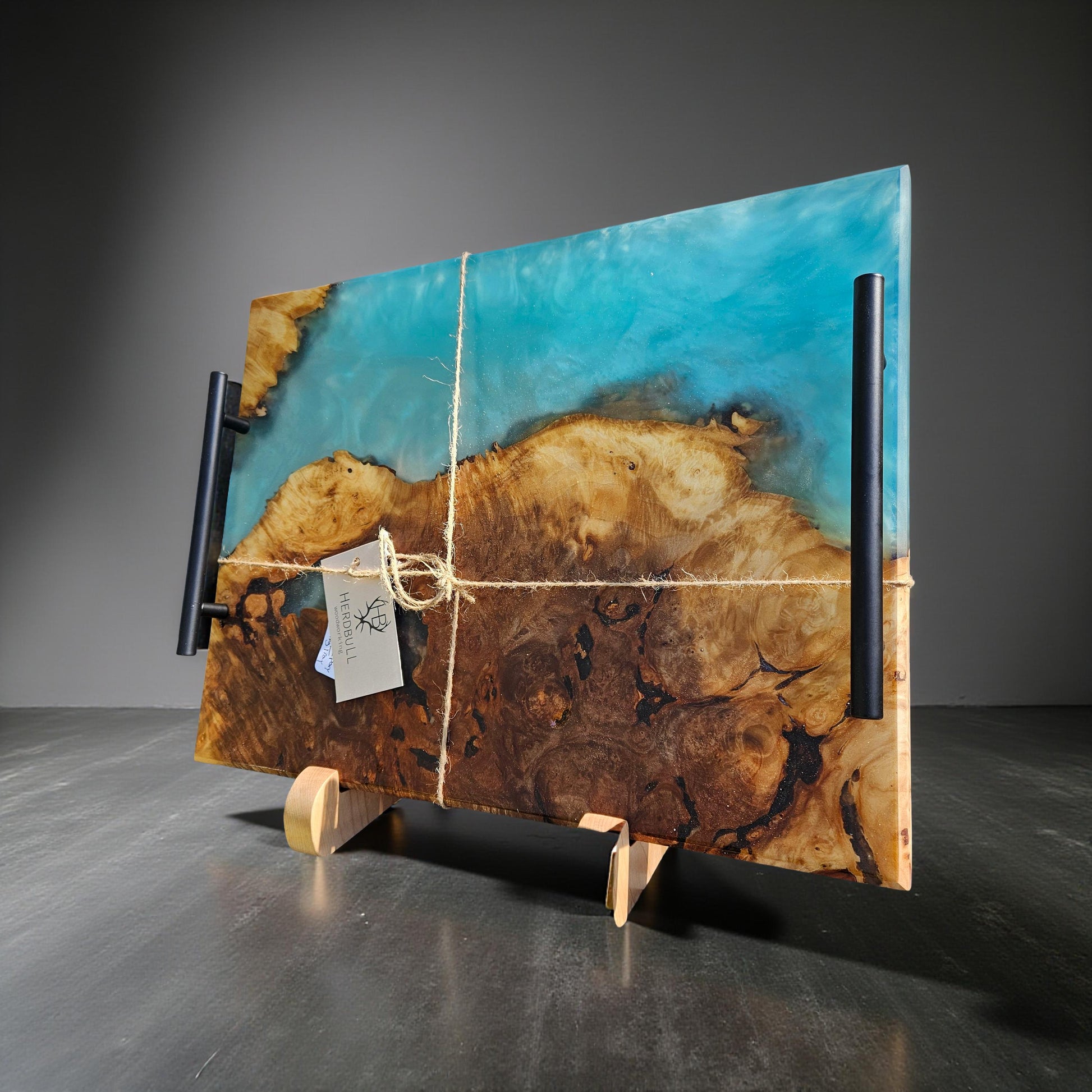Crafted from live edge ambrosia maple, this serving tray combines natural artistry with durable functionality. The striking blue epoxy highlights the wood's unique character, while black handles offer a secure grip. Rubber feet protect surfaces and enhance stability, making it a refined piece ideal for both serving and display.