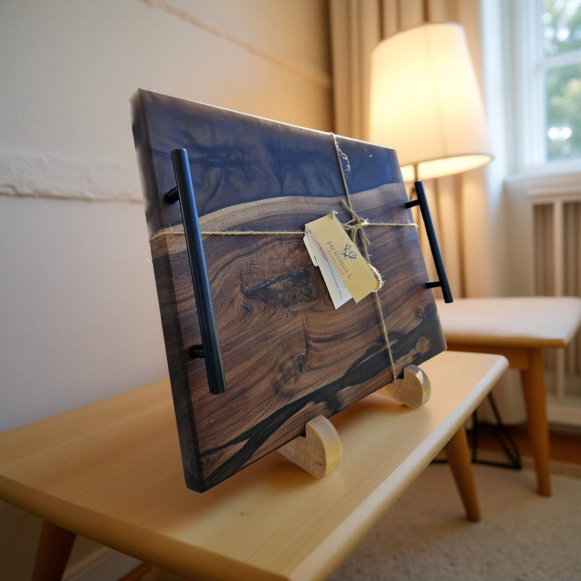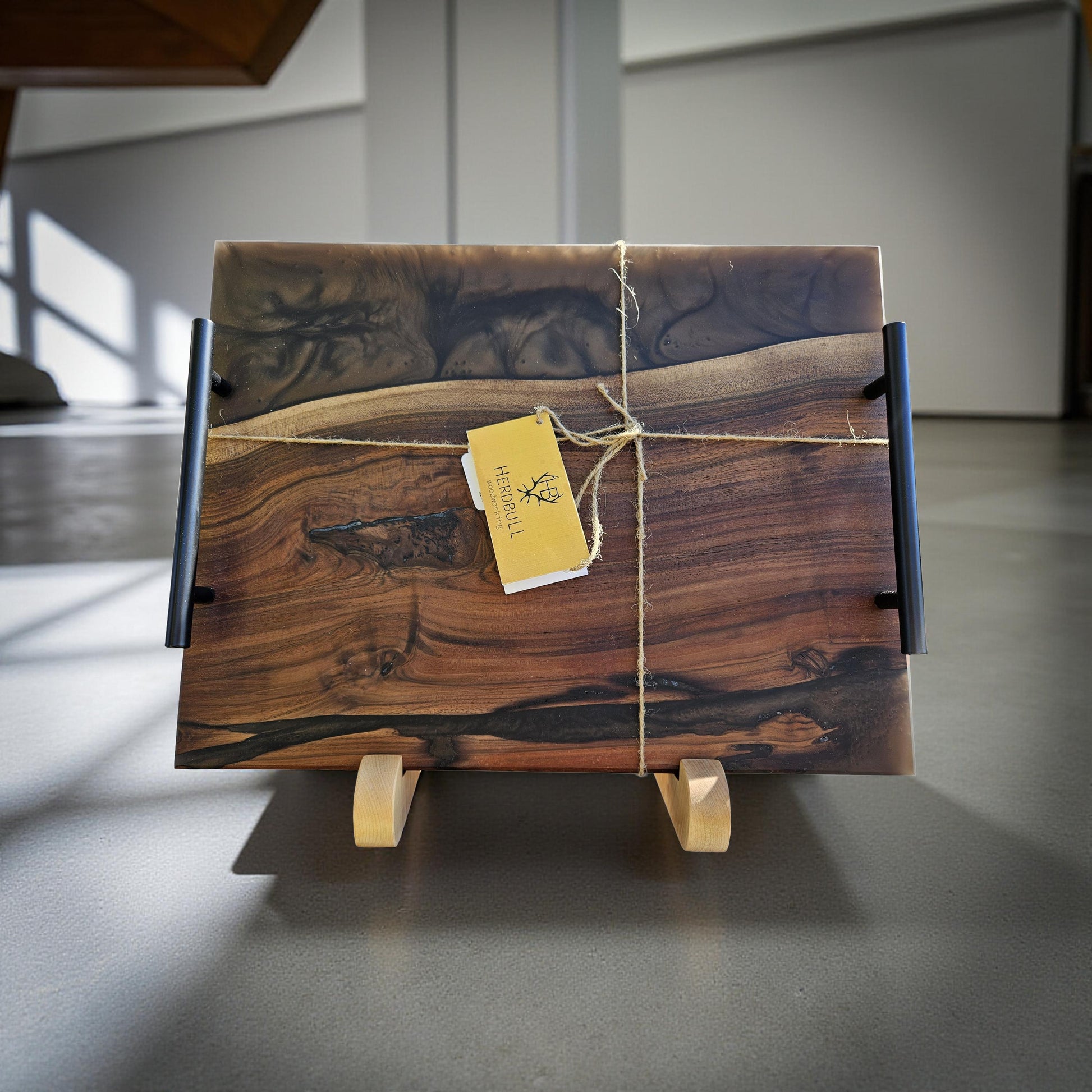 Crafted from live edge black walnut, this serving tray features a rich brown epoxy that accentuates the wood’s natural grain. Equipped with black handles for easy carrying and rubber feet to protect surfaces, it combines functionality with a sleek, modern aesthetic ideal for both casual and formal settings.