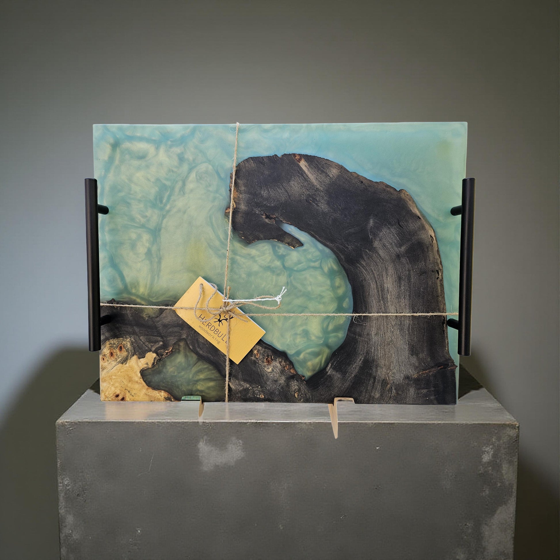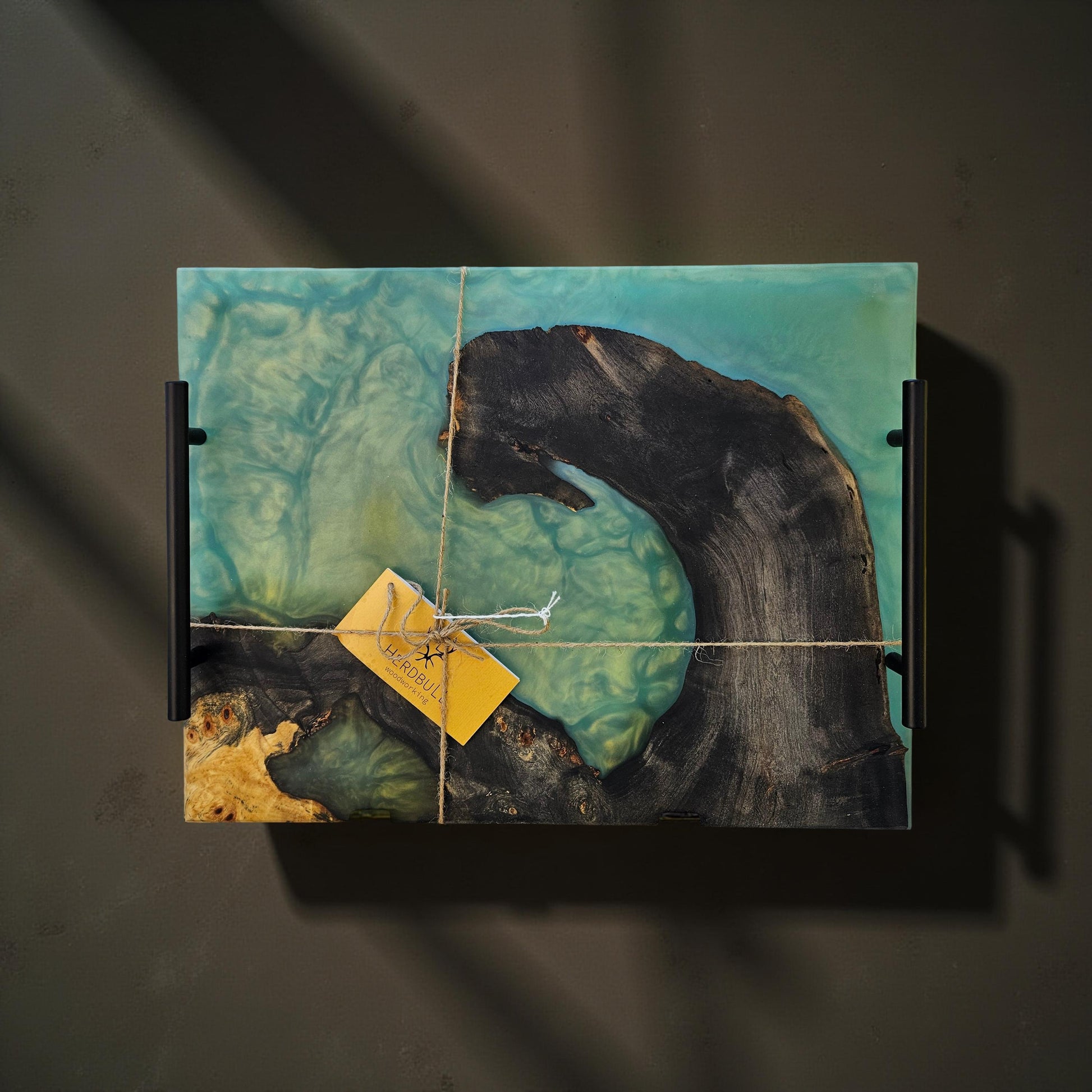Crafted from Buckeye Burl, this serving tray features a blue-green epoxy inlay paired with sturdy rubber feet and elegant black handles, making it an excellent choice for sophisticated dinner gatherings.