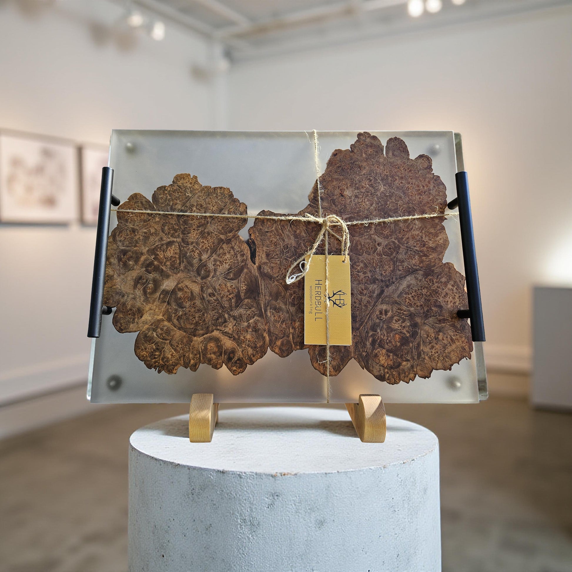Elevate your dining experience with this Maple Burl Epoxy Serving Tray, featuring a clear epoxy finish that highlights the natural beauty of the burl. Designed with black handles and rubber feet, it combines functionality with a sleek, clean aesthetic, ensuring stability and effortless handling during your dinner parties. Its expert craftsmanship makes it both a stunning centerpiece and a practical serving solution.